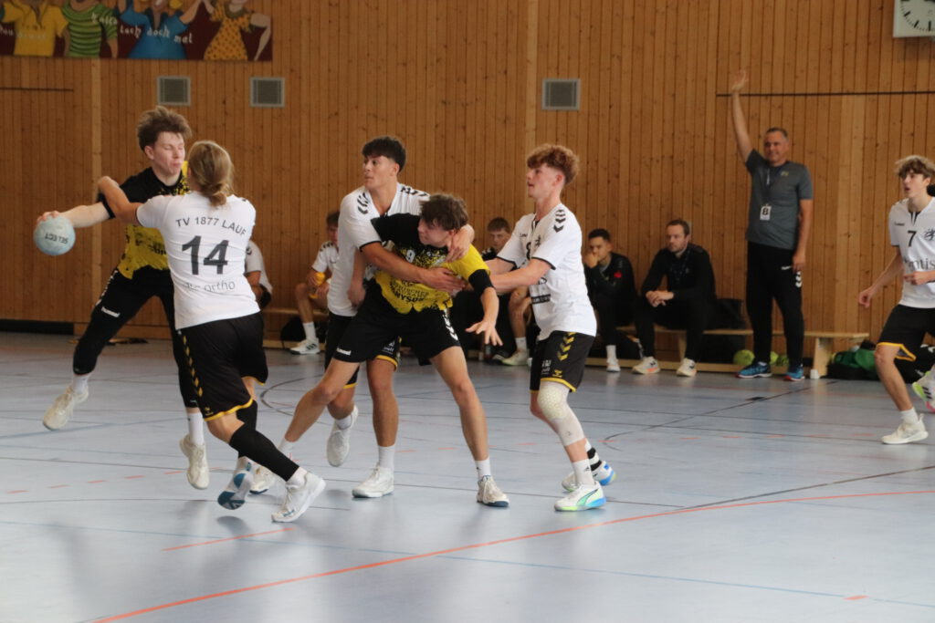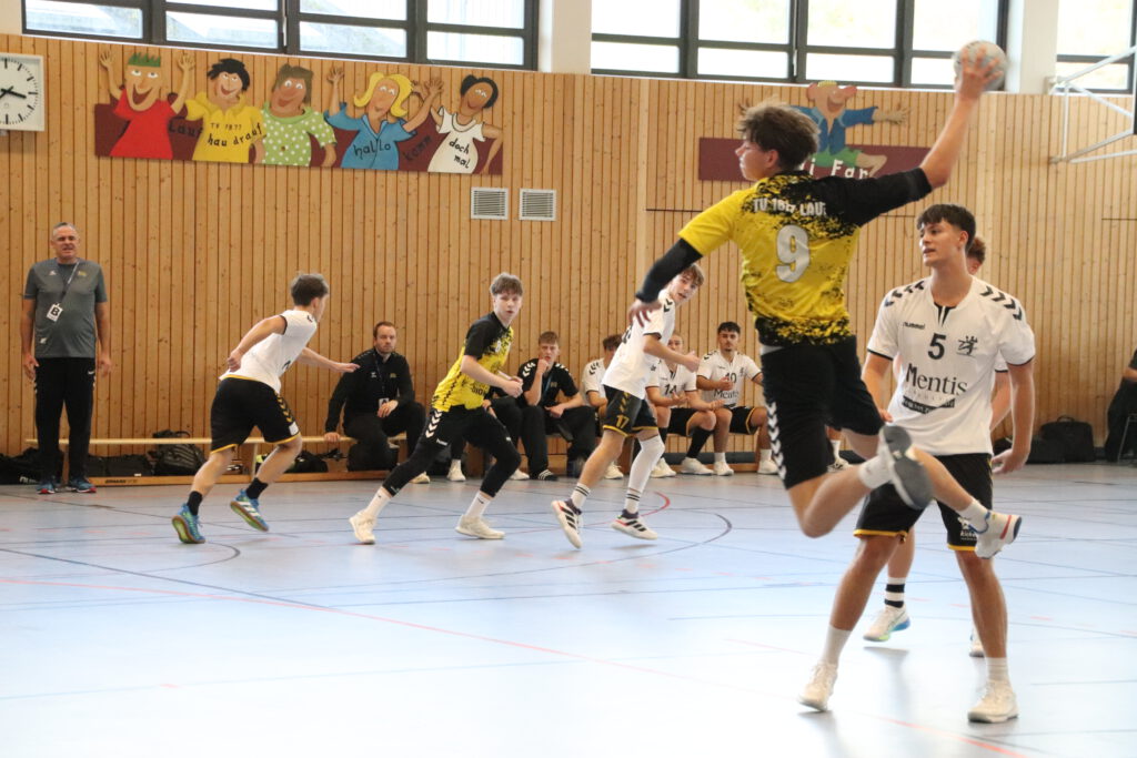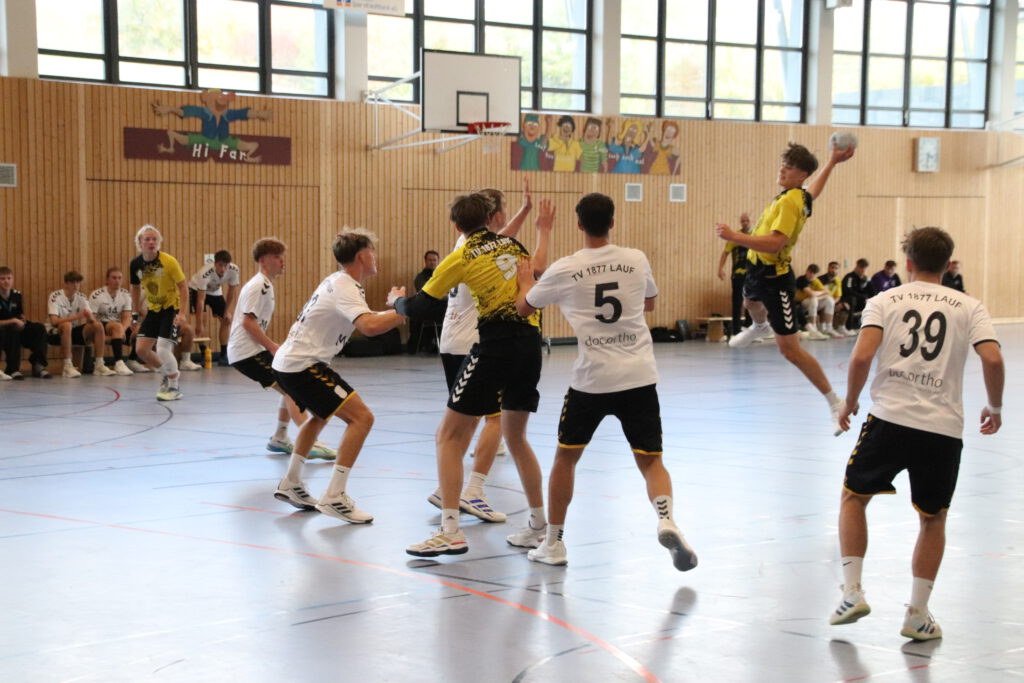 Was für ein Nachmittag in der Haberloh-Halle! Die männliche A-Jugend des TV 77 Lauf hat ihren ersten Saisonsieg gefeiert – und das auf eine Art, die allen gezeigt hat, was in dieser Mannschaft steckt. Nach einem holprigen Start entwickelte sich ein Spiel, das an Leidenschaft, Teamgeist und Emotion kaum zu überbieten war (falls sich jemand wundert, warum die Gäste in weißen Laufer Trikots spielen: sie hatten nur einen Satz schwarz-gelbe Trikots dabei und sind auf den Laufer Auswärtssatz ausgewichen).
